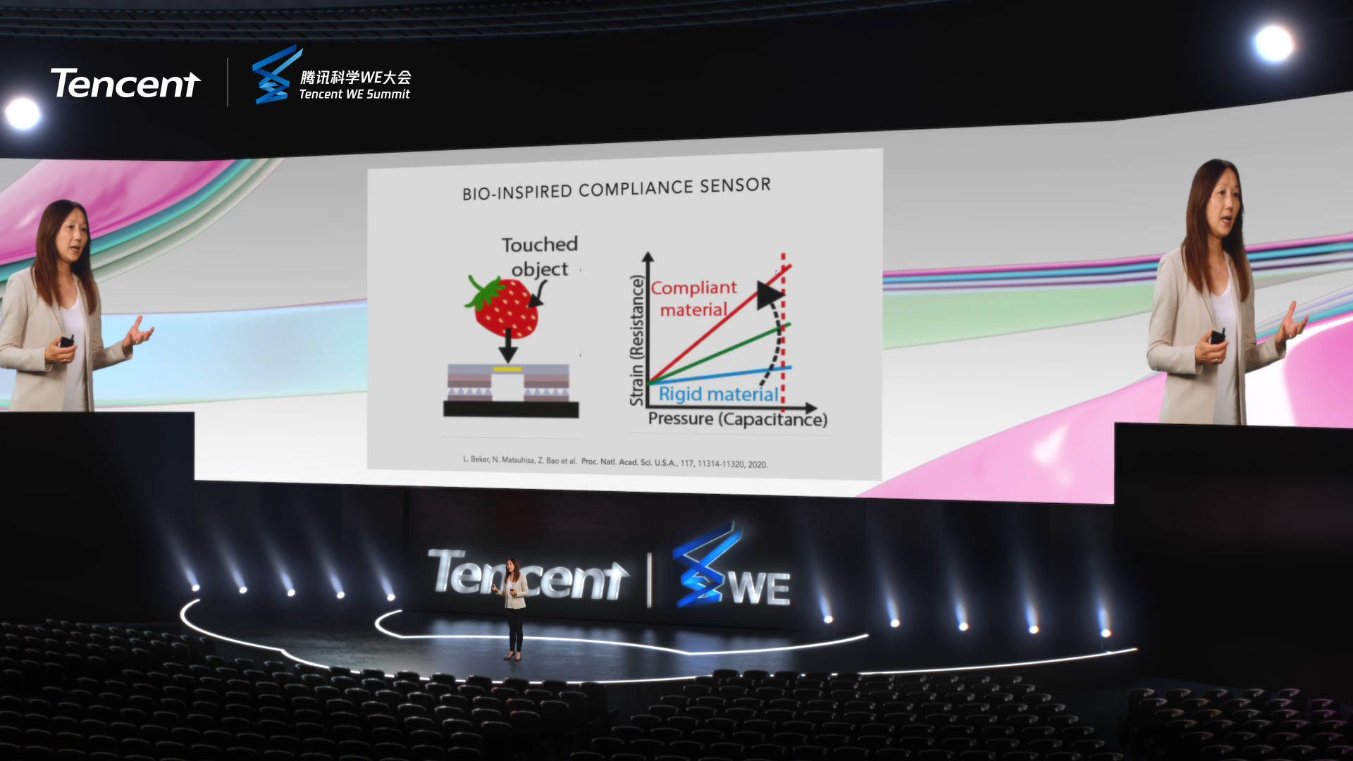 化学家、斯坦福大学化学工程系系主任鲍哲南被誉为人造皮肤领域的“材料大师”,她带来了关于“电子皮肤”的大胆设想。“我们将用如人的皮肤一样的电子器件,让人和人之间沟通,人与环境之间交流。”她讲解了人造皮肤的设计理念与实践过程,虽然目前人造皮肤还未真正用到人的身上,但这个理念已经被证实,并带来了许多意想不到的新启发,“用人造皮肤,现在可以做成连续的、测量血压的,轻轻贴在小婴儿身上这样的血压计。”此外,科学家鲍哲南还与腾讯科学WE大会推广大使、青年演员张新成一起交流,共同探讨“人造皮肤”技术,鼓励年轻人关注科学、热爱科学。