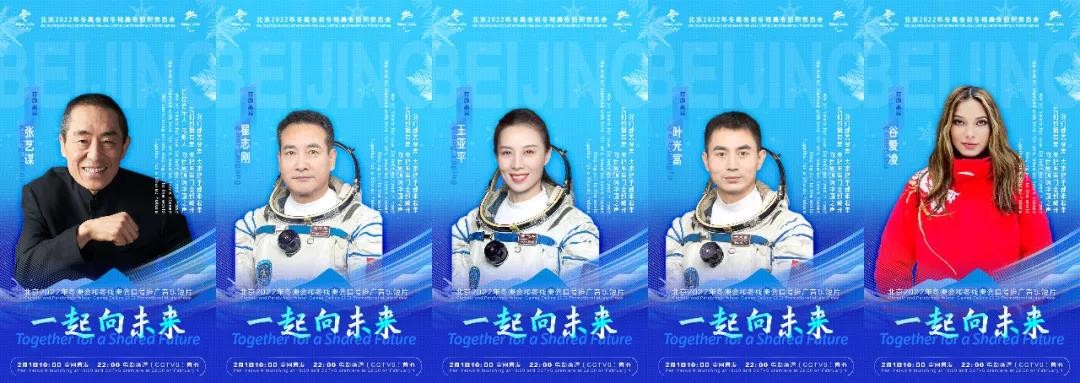 由电影频道节目中心、北京冬奥组委文化活动部、香港TVB、人民日报社新媒体中心出品,阿里巴巴集团联合摄制的北京2022年冬奥会暨冬残奥会口号推广音乐短片《一起向未来》于2月1日上午10时在全网发布,并于22时在CCTV6电影频道电视首播。该片由王平久作词并担任总策划,常石磊作曲并担任总制作人,付杰任总导演,成龙、曾志伟任艺术指导,由105组海峡两岸暨香港、澳门音乐人、电影人,及北京2022年冬奥会和冬残奥会开闭幕式总导演张艺谋,中国航天员翟志刚、王亚平、叶光富,北京冬奥会中国代表团运动员谷爱凌共5名特邀嘉宾联袂出演,以歌咏志,以影抒怀,向世界展现中国人民各美其美、美美与共的崇高理想,表达中国人民与世界人民携手并肩共克时艰、共创未来的坚定决心。在农历壬寅虎年大年初一,中国传统春节辞旧迎新时刻,北京2022年冬奥会倒计时3天之际,《一起向未来》音乐短片为中国与世界献礼,邀约大家迎接新的开始,一起向未来。
